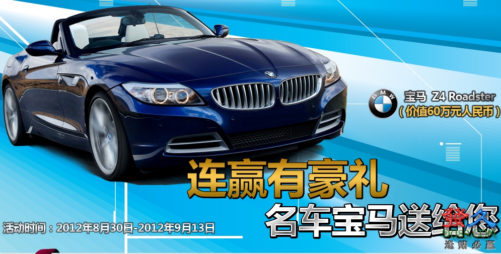 活动名称:和记娱乐连赢有豪礼,名车宝马送给您 活动时间:2012年08月30日——2012年09月13日 活动奖品:宝马 5系(530Li)