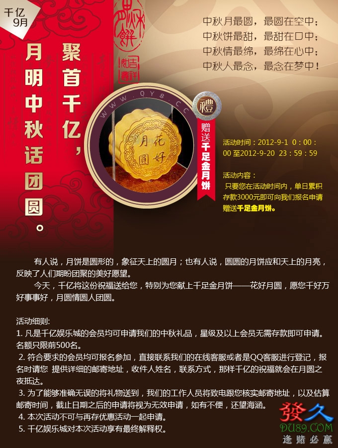 1.单日累积存款3000元即可向我们报名申请赠送千足金月饼. 2.星级及以上会员无需存款即可申请赠送千足金月饼. 3.名额只限前500名. bbs.du89.cc发久 博彩策略(论坛)http://bbs.du89.com